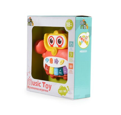A narancssárga színű játék piano formáját ötvözi egy barátságos rákkal, ami biztosan felkelti a kicsik figyelmét.