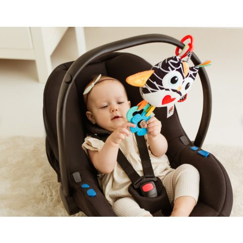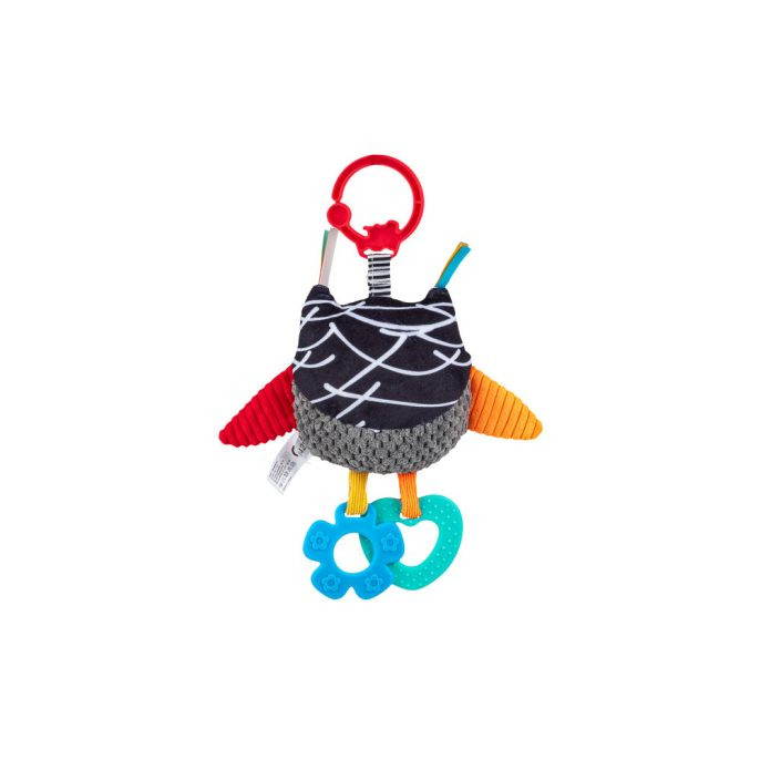 Különböző textúrájú anyagokból készült, így segít fejleszteni a baba érzékszervi észlelését és kíváncsiságát. A két rögzített rágóka megkönnyebbülést nyújt a fogzás során, míg a kompakt kialakítás és a praktikus klip lehetővé teszi a könnyű rögzítést bárhol.