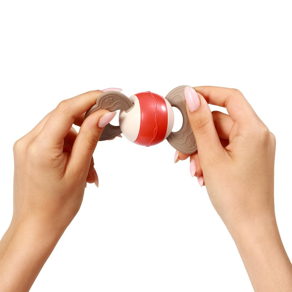 A csörgő praktikus felépítésének köszönhetően a baba könnyedén tudja a kis kezében tartani.